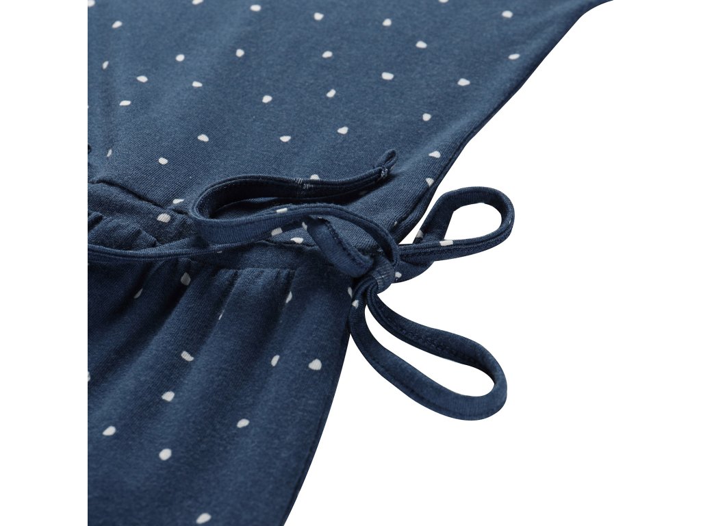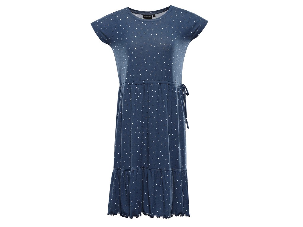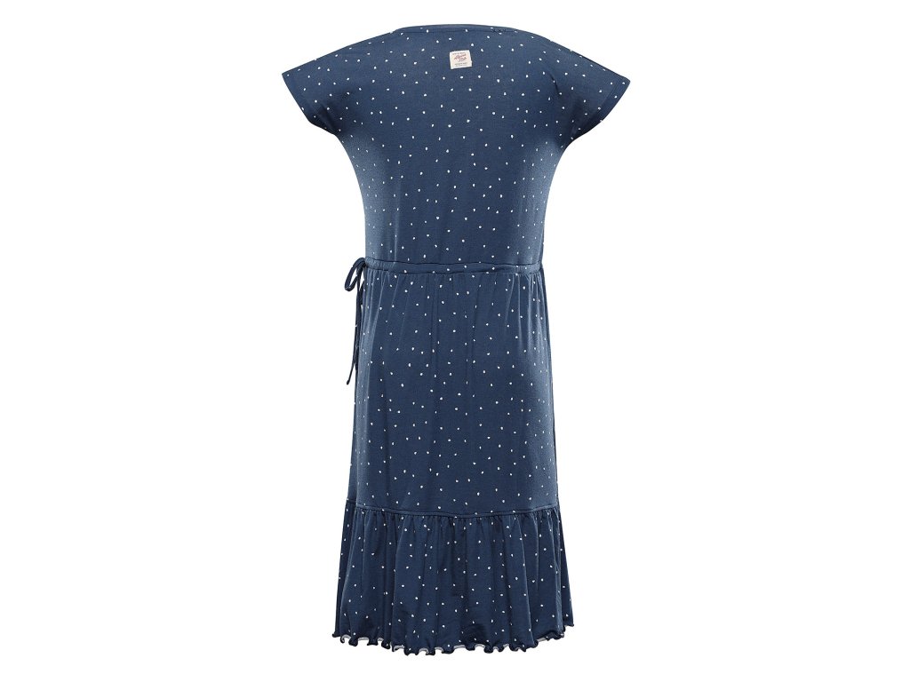 Dámské šaty volnějšího střihu s krátkým rukávem. Mají kapsy na bocích a na předním díle kontrastní potisk. Jsou v délce nad kolena. Šaty jsou vyrobené z příjemného bavlněného materiálu.