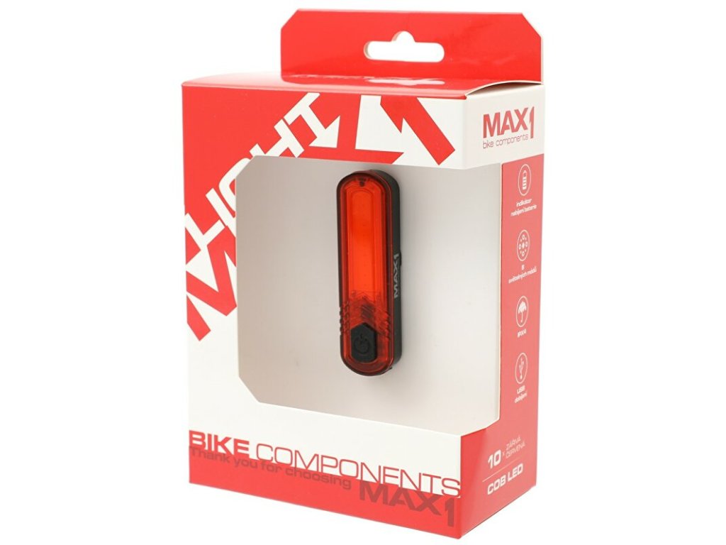 Ultralehká zadní USB blikačka MAX1 Cobo s 10 COB LED diodami a 8 světelnými režimy. Díky systému uchycení pomocí gumového držáku můžete blikačku namontovat na kolo, hůlky, kočárek, apod.Technické parametry: