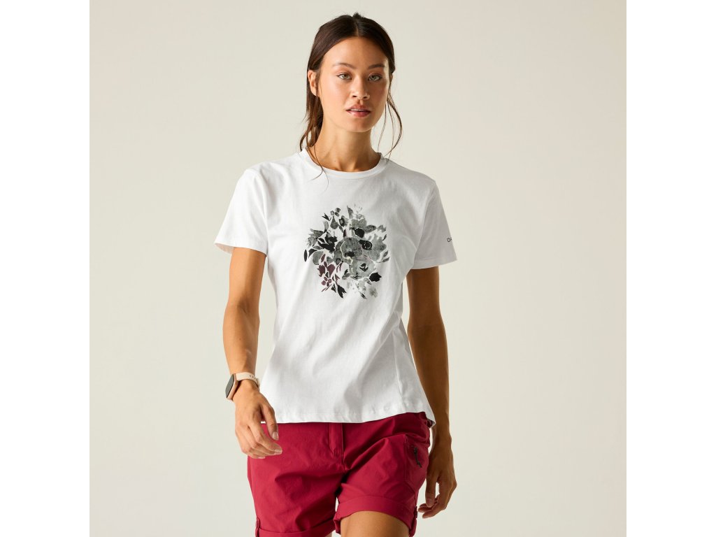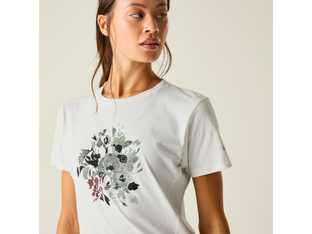 Bavlněné dámské tričko s krátkými rukávy, kulatým výstřihem a kontrastním postiskem.