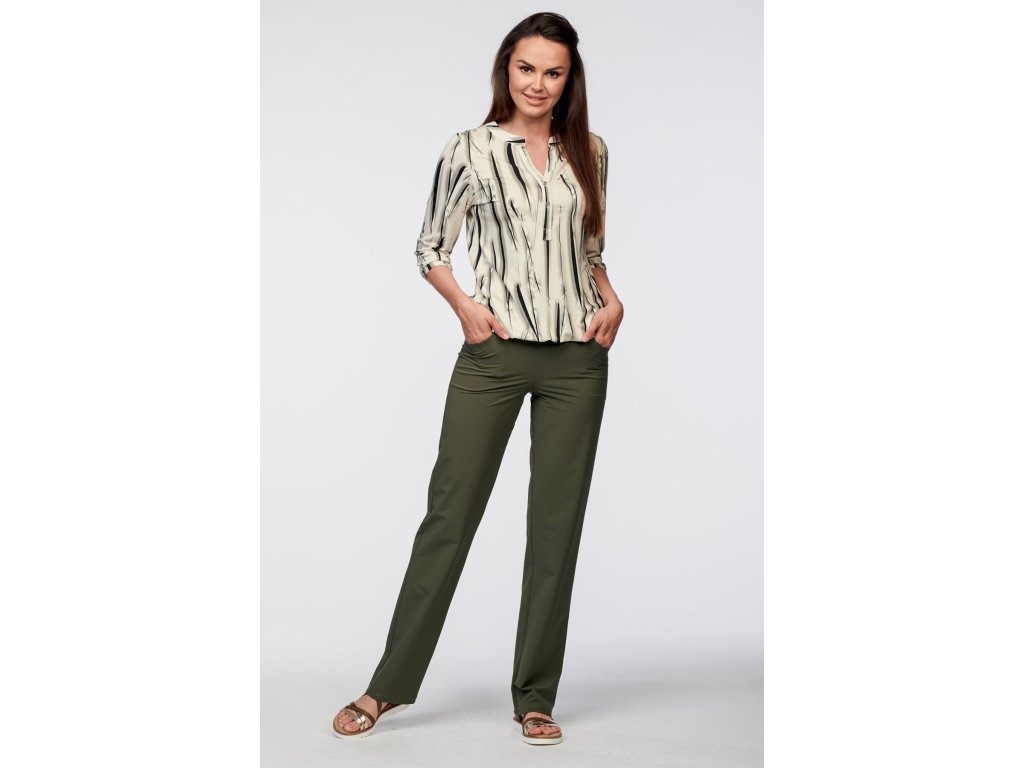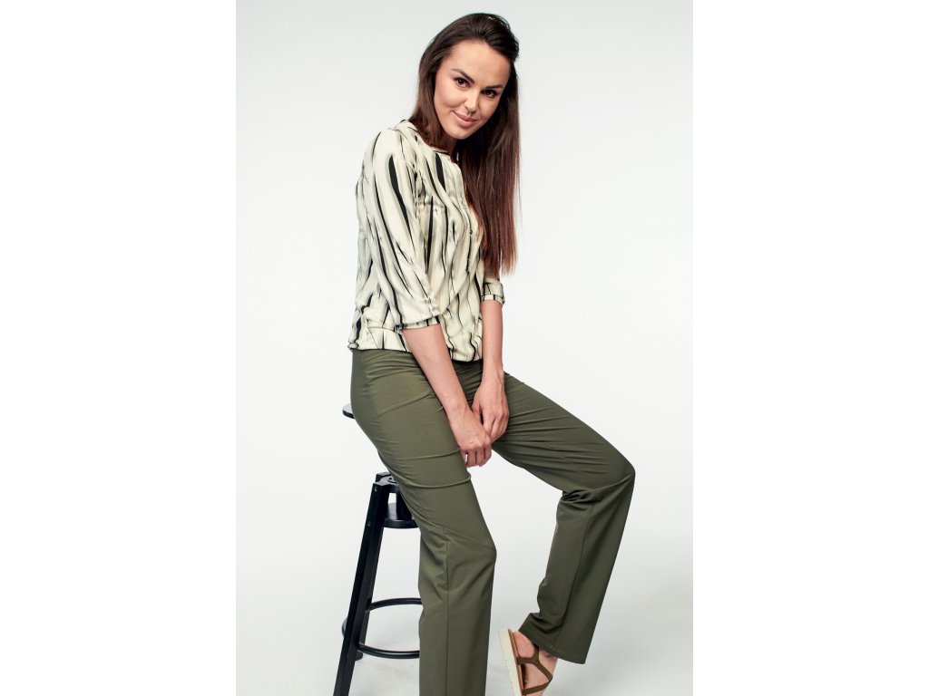 Volnější kimonový střih. Na předním díle je kontrastní potisk. Tričko je vyrobené z čárkovaného viskózového materiálu.