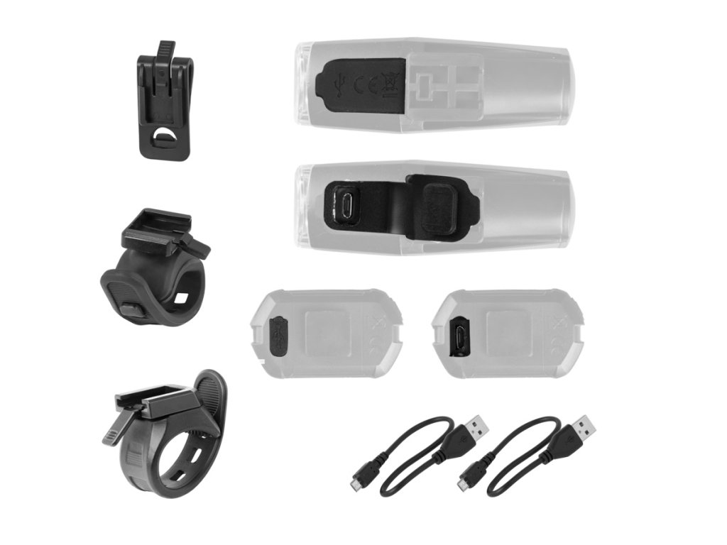Součástí balení jsou držáky na řídítka, sedlovku a dobíjecí USB kabel.