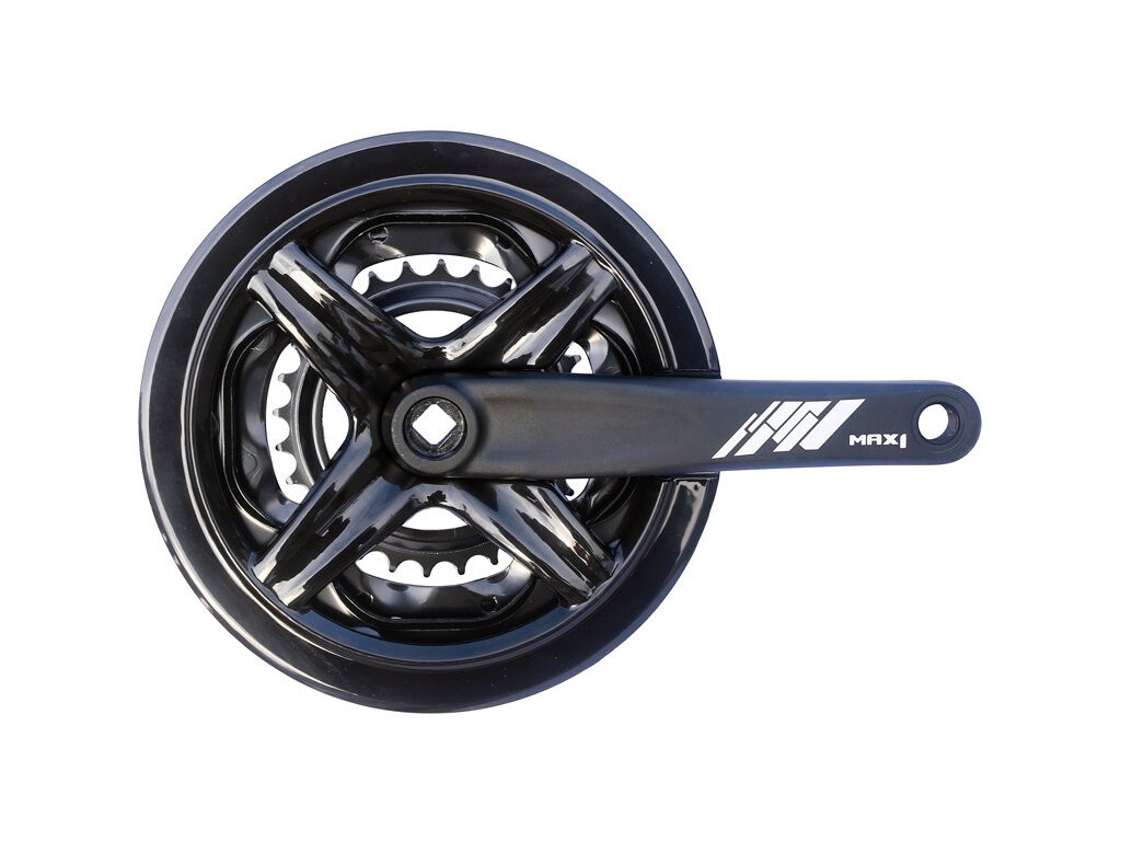 Kliky MAX1 Tour s trojpřevodníkem určené pro crossová kola. Matné Al kliky s nýtovanými ocelovými převodníky a lesklým plastovým krytem.