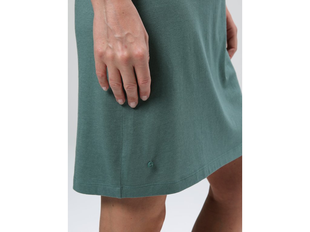 Dámské šaty volnějšího střihu s krátkým rukávem. Mají kapsy na bocích a na předním díle kontrastní potisk. Jsou v délce nad kolena. Šaty jsou vyrobené z příjemného bavlněného materiálu.