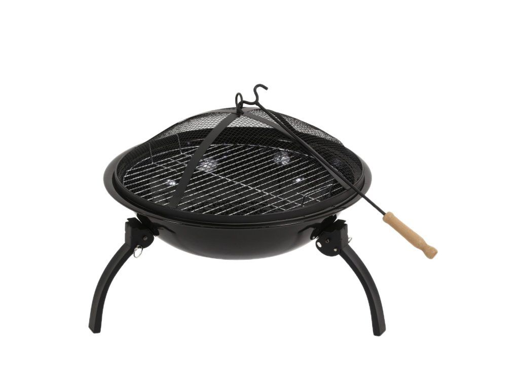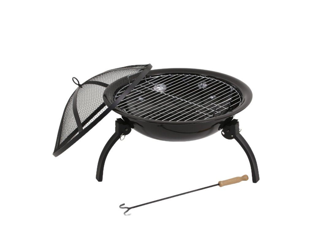 - Součástí je stojan, rošt na polena, ochrana proti jiskrám, grilovací mřížka a pohrabáč