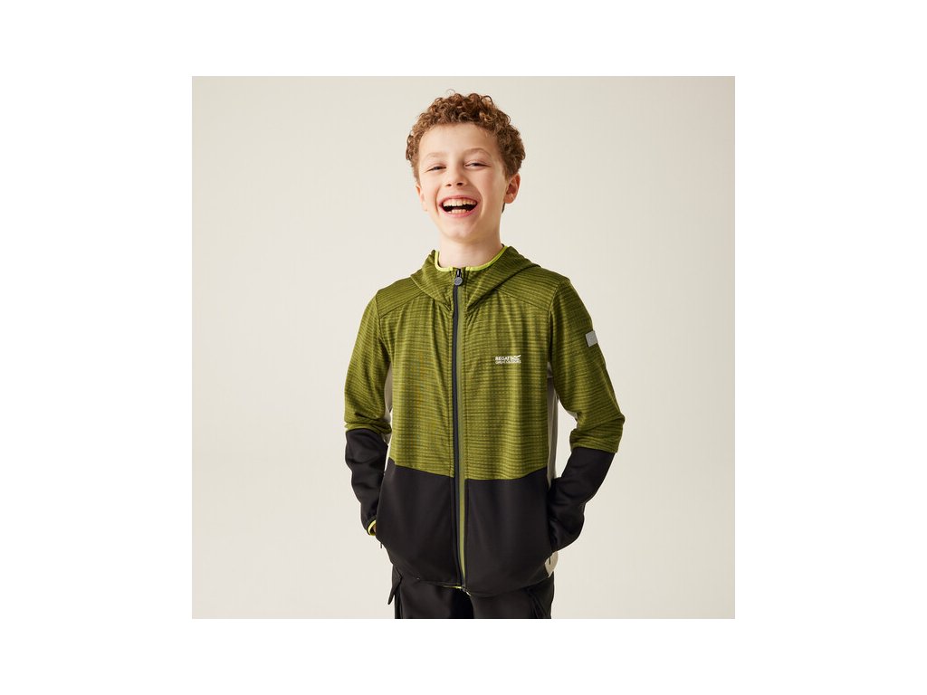 Dětská střední vrstva, vyrobená z naší recyklované tkaniny iLUS Core Stretch - kombinující vlastnosti 4-směrného strečování - poskytuje neomezený pohyb. Fleecové panely je udrží v teple a pohodlí. Díky přírodní antibakteriální úpravě kontroly zápachu zůstanou svěží i na cestách. Dětská bunda na zip je zakončena UV50+ ochranou. Recyklovaná štětcová strečová tkanina s příjemnými pruhovanými melanžovými fleecovými panely - Ilus Core Vyrostlé na kapuci Zip po celé délce Vnitřní zip a chránič brady 2x spodní kapsa na zip UV ochrana (UPF) 50+